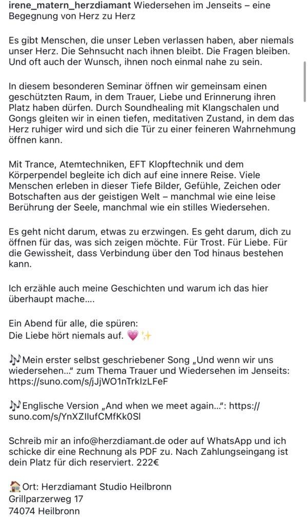 - Seminare wie „Wiedersehen im Jenseits“ für eine kleine Gruppe vor Ort (4h)
