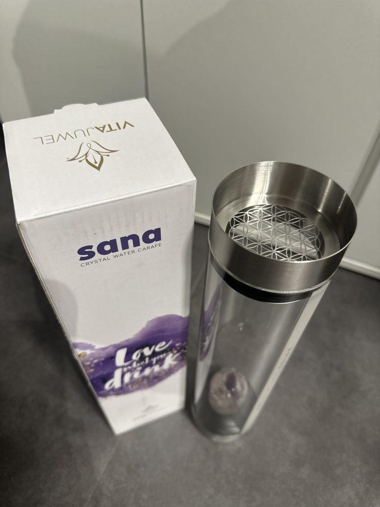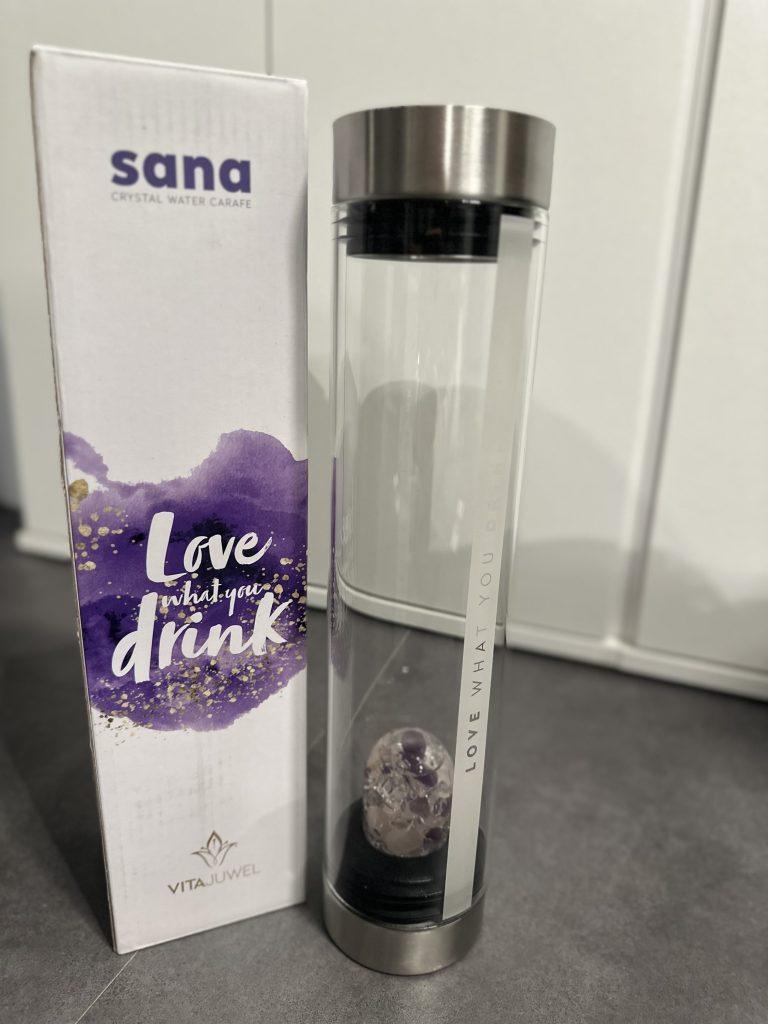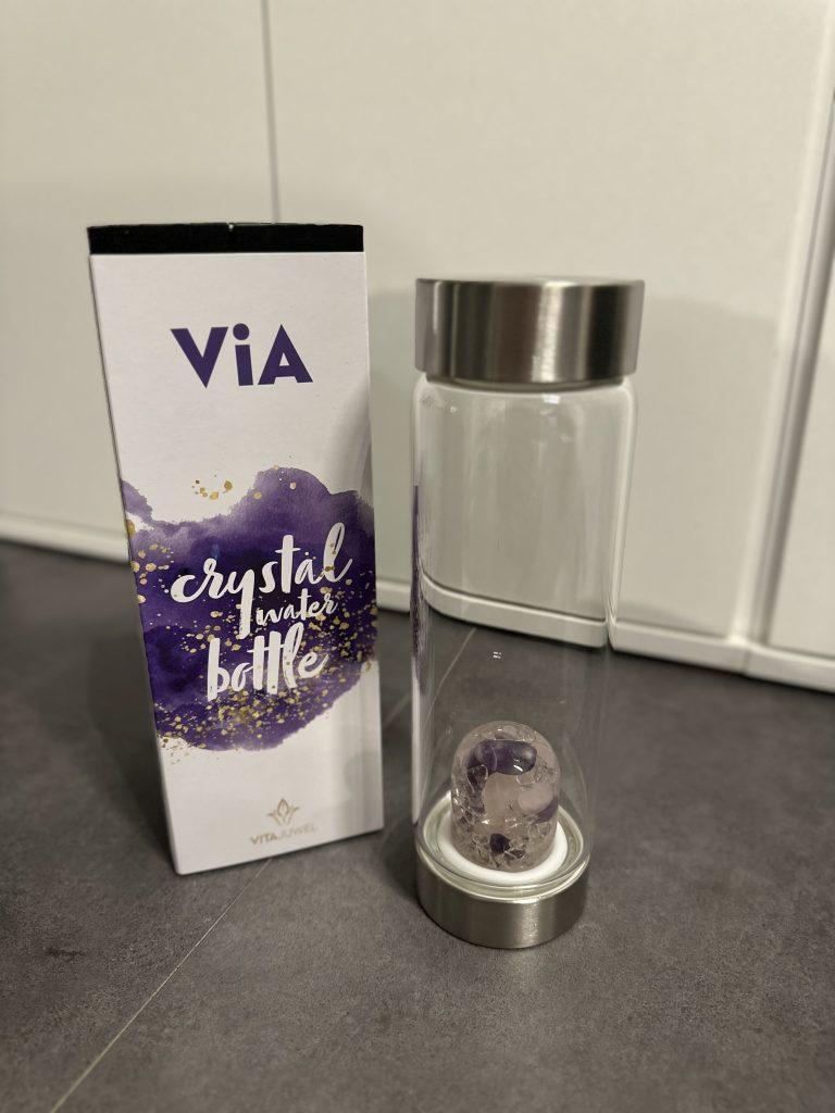 Edelstein Wasserflasche to go oder Karaffe WELLNESS Mischung (Amethyst, Rosenquarz, Bergkristall) von der Firma VitaJuwel, Edelstahl und Glas.